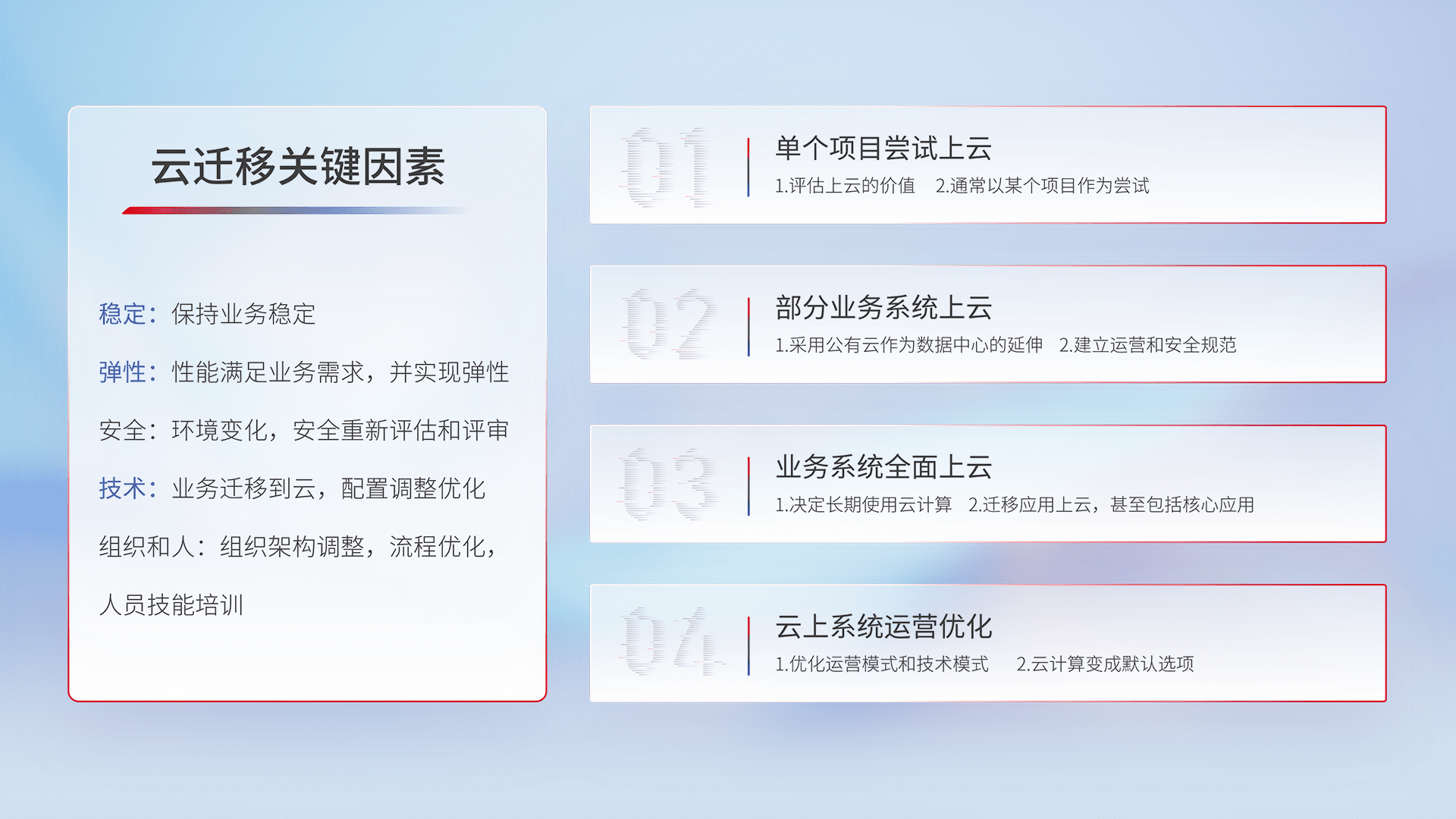 结合实际业务,,从规划设计、、云平台选型、、、云原生改造、、、数据迁移、、、集成交付,,,迁移全过程为客户识别最佳上云路径,,,做好风险识别管理,,,设计网络架构、、身份权限、、、安全审计合规、、操作审计、、、日志审计、、、监控告警策略、、多站点容灾设计等,,,,对云上基础设施进行整体规划,,,,提升IT治理水平,,,以满足弹性、、、高可用、、、高性能的需求。。。