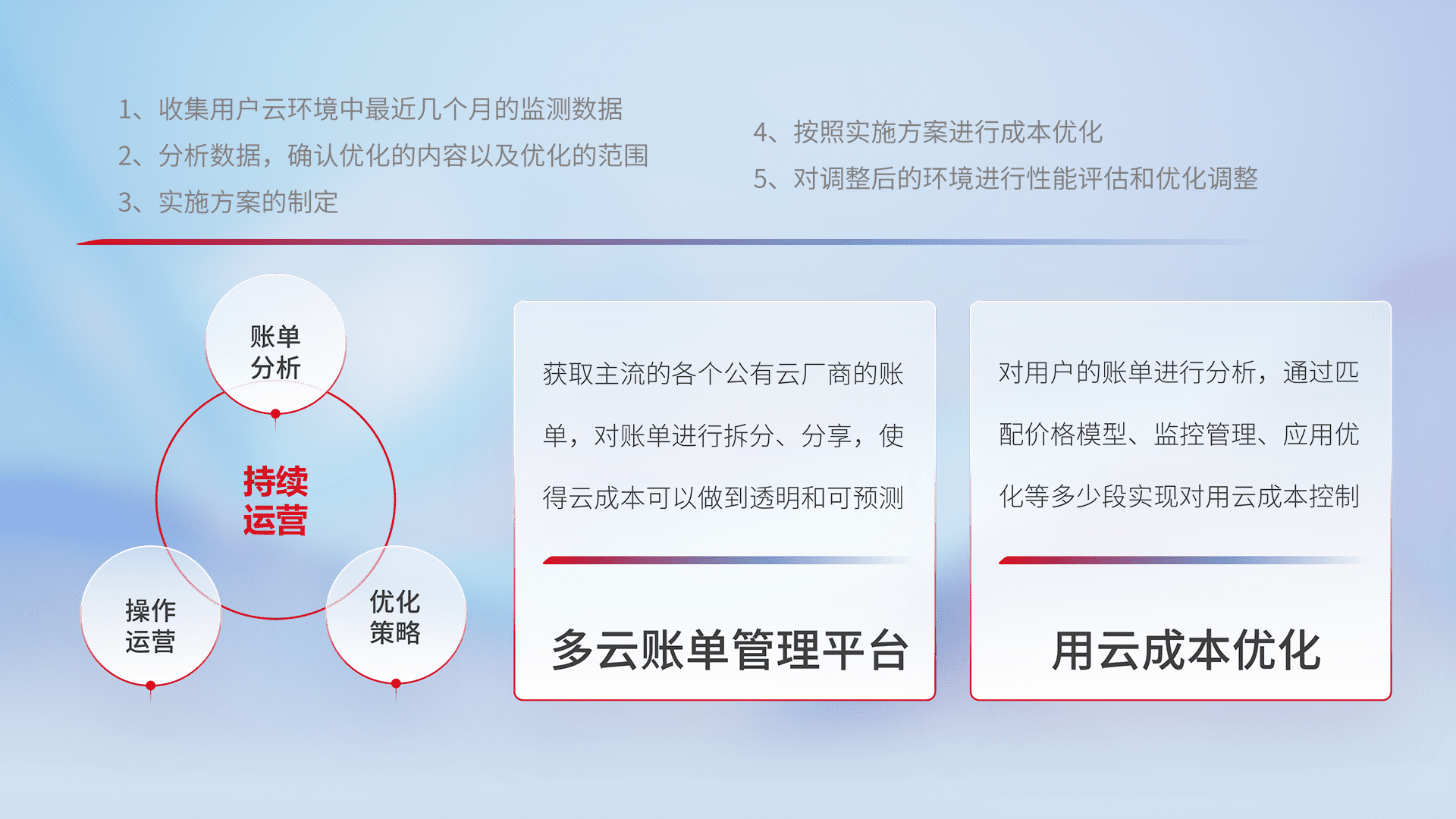 通过多云纳管,,以统一的资源数据模型把客户的云资源进行抽象和封装,,,,进而实现对多云资源的统一操作,,,,保障云资源管理的可靠性、、稳定性与可用性。。。量身定制化运维内容,,,,配置、、、开发运维、、、补丁管理、、、备份、、、、监控、、、、认证和访问管理、、、、审计和日常巡检等,,,保障在用云过程中的可靠度,,稳定度以及高可用率。。。。