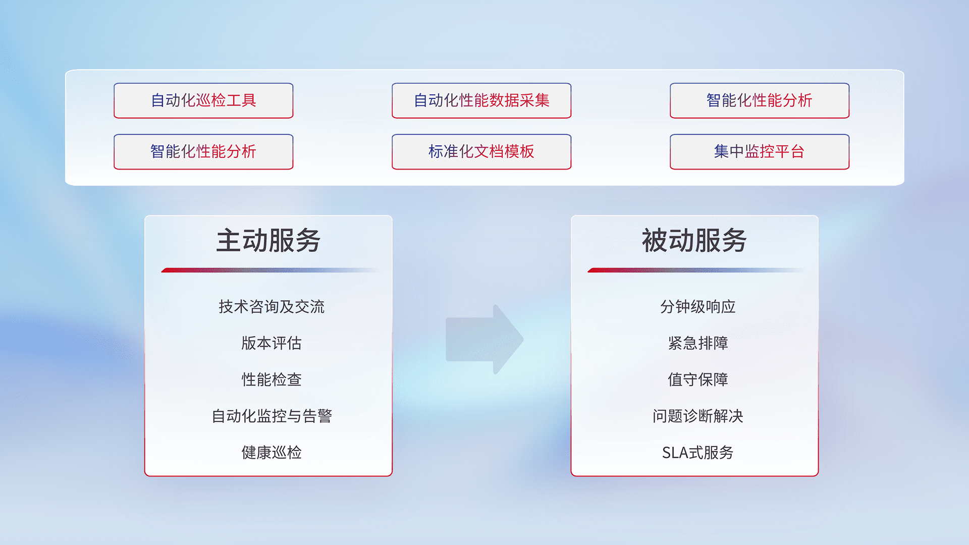 智能化工具和标准化文档,,保障服务质量,,,提供主动服务(包含技术咨询、、版本评估、、、性能检查、、、自动化监控与告警、、健康巡检)和被动服务包含(分钟级响应、、紧急排障、、、、值守保障、、问题诊断解决、、、、SLA服务)。。