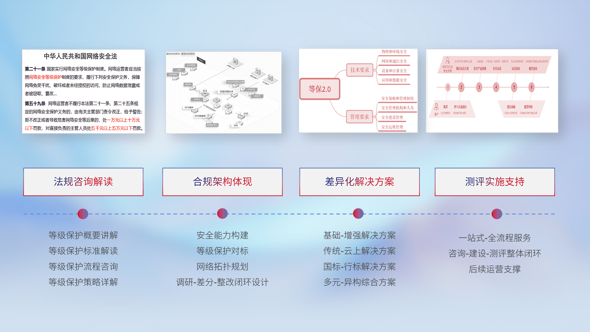 通过专业的法律咨询解读、、合规架构体现、、、、差异化解决方案、、测试实施支持等服务,,,为客户量身打造等保合规体系。。。